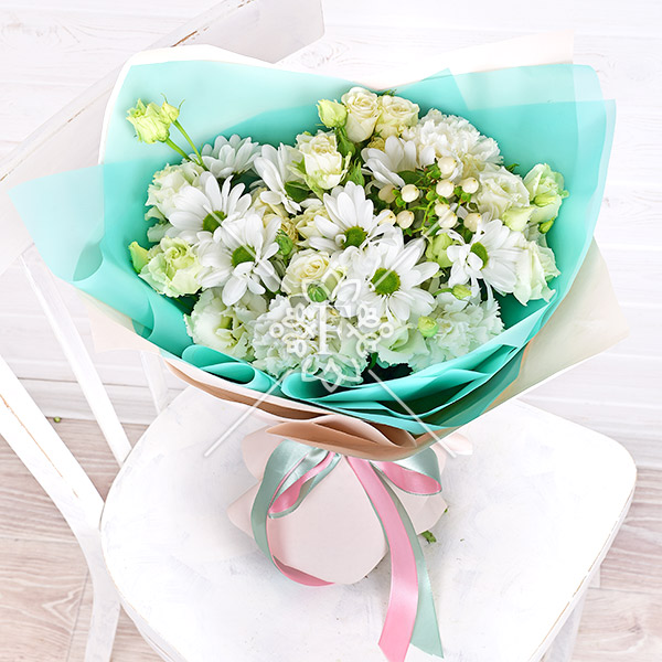 роза кустовая белая – 1 шт., эустома белая – 2 шт., гвоздика белая – 3 шт., хризантема белая кустовая – 1 шт., гиперикум белый – 1 шт., упаковка, лента.